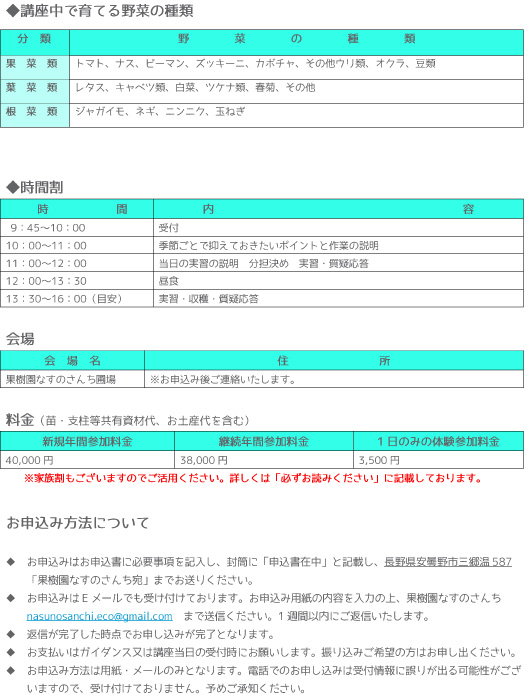 このワークショップは日本北アルプスの麓、長野県安曇野市を舞台に参加者全員で一つの畑を月1~2回の開講日でお世話し、少量多品目栽培していきます。