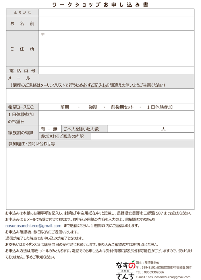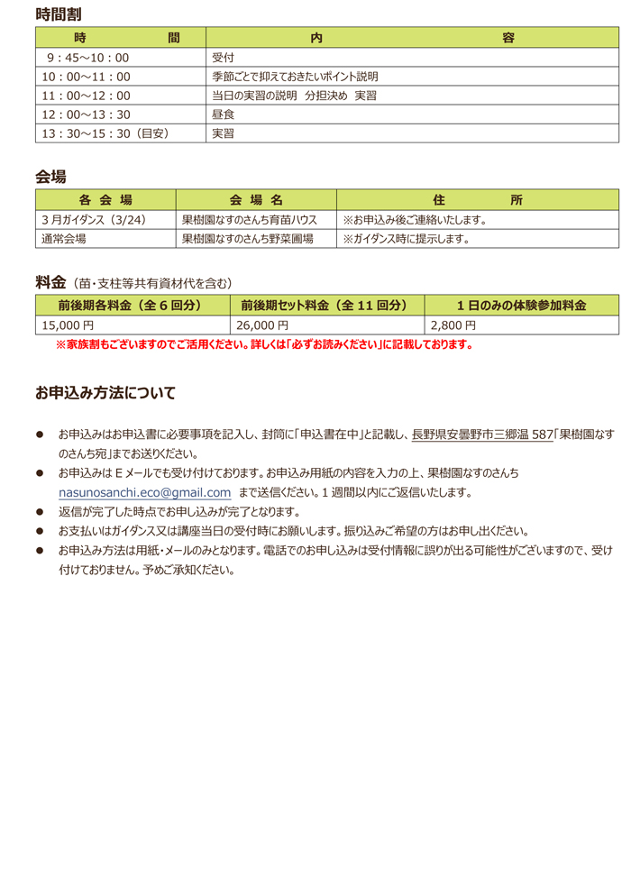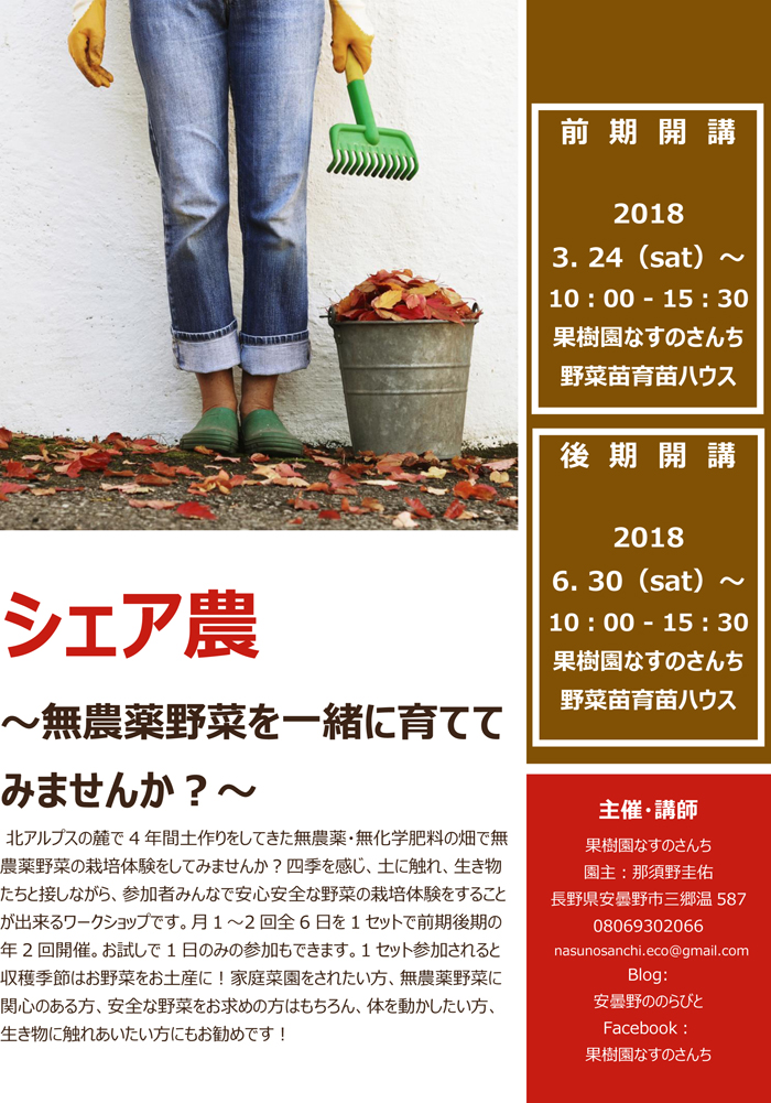 果樹園なすのさんち主催、「シェア農(仮)」と題しまして、自然系栽培を主体とした栽培体験型のワークショップです。